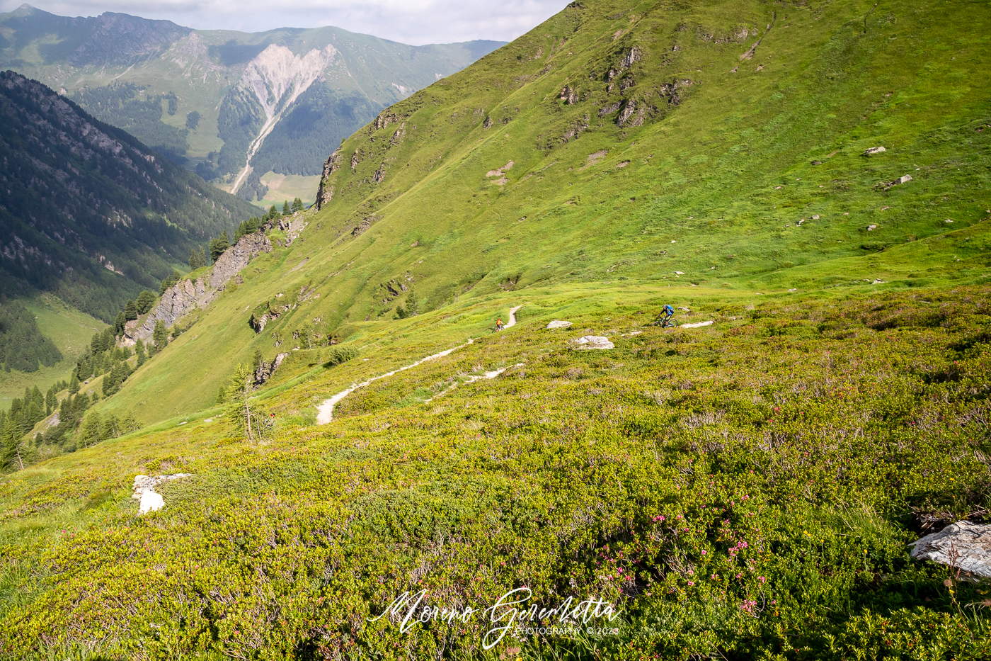 Si tratta di un sentiero condiviso con gli escursionisti ma aperto alle biciclette. Non un vero flow trail quindi ma comunque qualcosa di estremamente divertente, inserito in un paesaggio da cartolina, una tavolozza verde punteggiata del rosa dei rododendri.