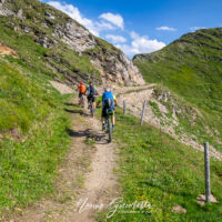 Il bosco si dirada e il paesaggio ci avvolge in un susseguirsi di verdi prati, qualche baita e la corona di montagne che dobbiamo superare. Si pedala su terra bella compatta, un piacere salire accarezzati da un venticello rigenerante, sembra di essere veramente ad un passo dal cielo. In prossimità del valico si percorre l’ultima parte un pò esposta ma molto larga in piano ed ecco la val di Vizze aprirsi sotto di noi. Assistiamo per qualche minuto al gioco di una famigliola di marmotte, uniche forme di vita incontrate quassù oltre a quattro amici soddisfatti di un ennesimo giro epico, quattro e-bike e il vento.