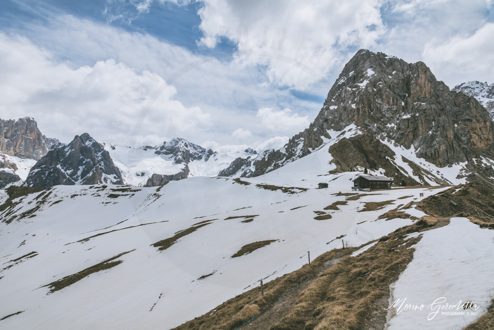 Man mano che salivamo, l’atmosfera cambiava. La neve tornava sotto i copertoni, il grip calava, i movimenti si facevano più cauti. Poi le nuvole. Grigio, scuro, quasi nero. Dal Sella avanzava una massa compatta, densa, viva. Sembrava venire addosso a noi. Il vento si alzava. Il freddo si faceva serio e anche i primi fiocchi di neve arrivavano a farci compagnia, una compagnia non proprio piacevole a primavera.